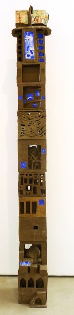 Il retourne également à la terre, au moment où une paix possible semble se dessiner au Proche-Orient, terre qu’il utilise pour modeler une œuvre étonnante à bien des égards, intitulée Les Accords de Taëf. Lui qui a évoqué dislocation et ruines dans plusieurs œuvres sur la guerre, modèle ici une longue colonne de 250 cm de haut, faite de l’empilement de onze petites structures cubiques, toutes différentes les unes des autres, certaines au décor oriental marqué d’arcatures, d’autres au décor plus rectiligne, plus ou moins ajourées, plus ou moins obturées, porteuses parfois d’élégantes peintures bleues à la tempera, ou encore ornées de colonnades ou de claustra, à travers lesquelles la lumière filtre en participant ainsi à l’œuvre. Chacun de ces modules superposés pourrait être « une unité d’habitation », si on utilise le langage de l’architecte Le Corbusier, car ce qui apparaît en premier, ça n’est pas ce qui au sommet de la colonne pourrait être un ensemble de documents symbolisant les Accords, mais bien plutôt, cette élégante superposition de lieux qui semblent habités par la vie, dans sa beauté et sa diversité même. Cette sorte de ville verticale semble suspendue à la promesse de paix que les Accords de Taëf recèlent.